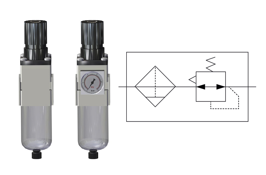 CARACTERÍSTICAS PRINCIPAIS - Modelo SMC AW20 - Conexões 1/4” G - Pressão máxima de operação 1,00 Mpa (10 bar) - Campo de ajuste 0,05÷0,85Mpa (0,5÷8,5 bar) - Temperatura de operação: -5/ +60°C - Grau de filtração 5μm - Capacidade de descarga 8 cm³ - Material: policarbonato - Construção do regulador: tipo relieving - Peso 0,2 Kg