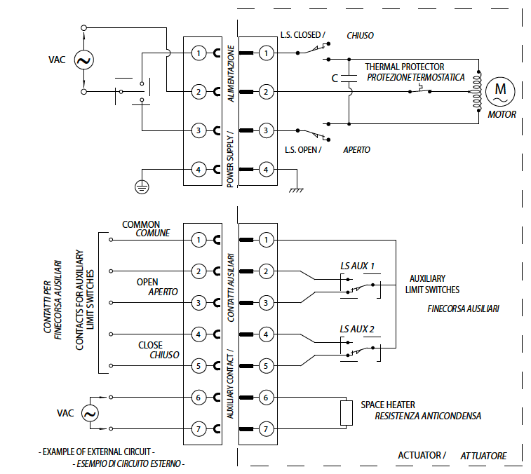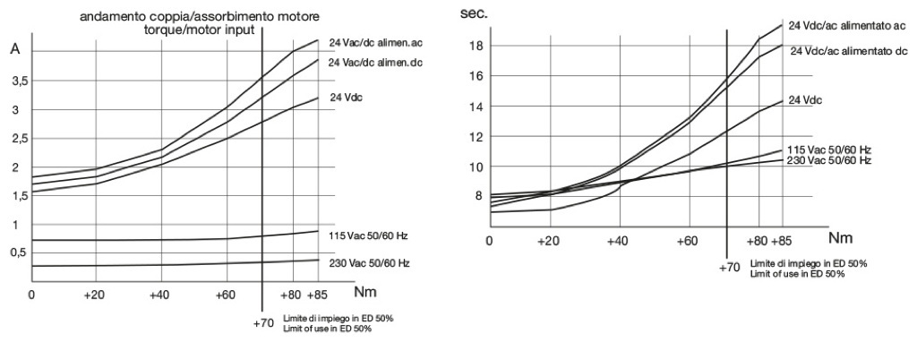 DADOS TÉCNICOS Ângulo de trabalho nominal: 90°ajustável entre 20°e 95° Tipo de regulação: contínua por meio de cames autofrenantes interruptores de limite eletromecânicos. Torque nominal de trabalho: de 35 a 240 Nm. Tempo de manobra (0°- 90°): ver o diagrama. Serviço: S3 ED 50% de acordo com CEI 60034. Conformidade com as normas: Diretiva de baixa tensão 2014/35/UE; Diretiva de compatibilidade eletromagnética 2014/30/CE. Grau de proteção: IP67 de acordo com a EN60529. Temperatura do ambiente de trabalho: -25°+ 60° C. Temperatura limite de armazenamento: -40°+ 90°C. Proteção termostática autoreset interna ao motor. Enrolamento do motor com isolamento de classe F (155°C). Rotor suportado em rolamentos a esfera. Conexão para acionamento manual de emergência (chave hexagonal incluída) Indicador visual externo a semáforo com zona superior graduada Resistência à condensação de série. Conexões elétricas através de conectores IP67, disponíveis a pedido com cabo pré-cablado. 2 interruptores de limite eletromecânicos SPDT para indicação auxiliar com cames ajustáveis em todo o curso. Nível máximo de ruído durante o funcionamento <70 dB (A). Tensão de alimentação: 230 Vac ±10%, 50/60 Hz monofásico; 115 Vac ±10%, 50/60 Hz monofásico; 24 V ac/dc ±10%; 24 V dc ±5%.