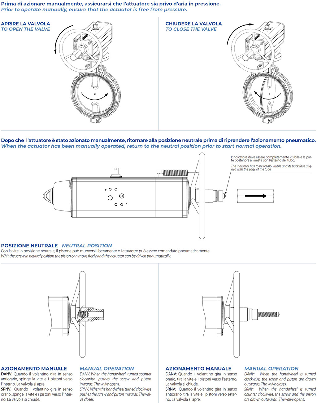 O dispositivo de acionamento manual atua na transmissão mecânica primária do atuador pneumático e na presença de torques aplicados ao volante em conformidade com a norma EN 12570 produz torques de saída com o mesmo valor que o torque nominal do próprio atuador.