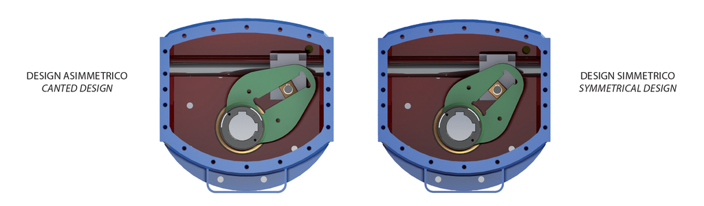 Configurações de corpo central: Scotch Yoke simétrica (symmetrical) ou Scotch Yoke assimétrica (canted)
