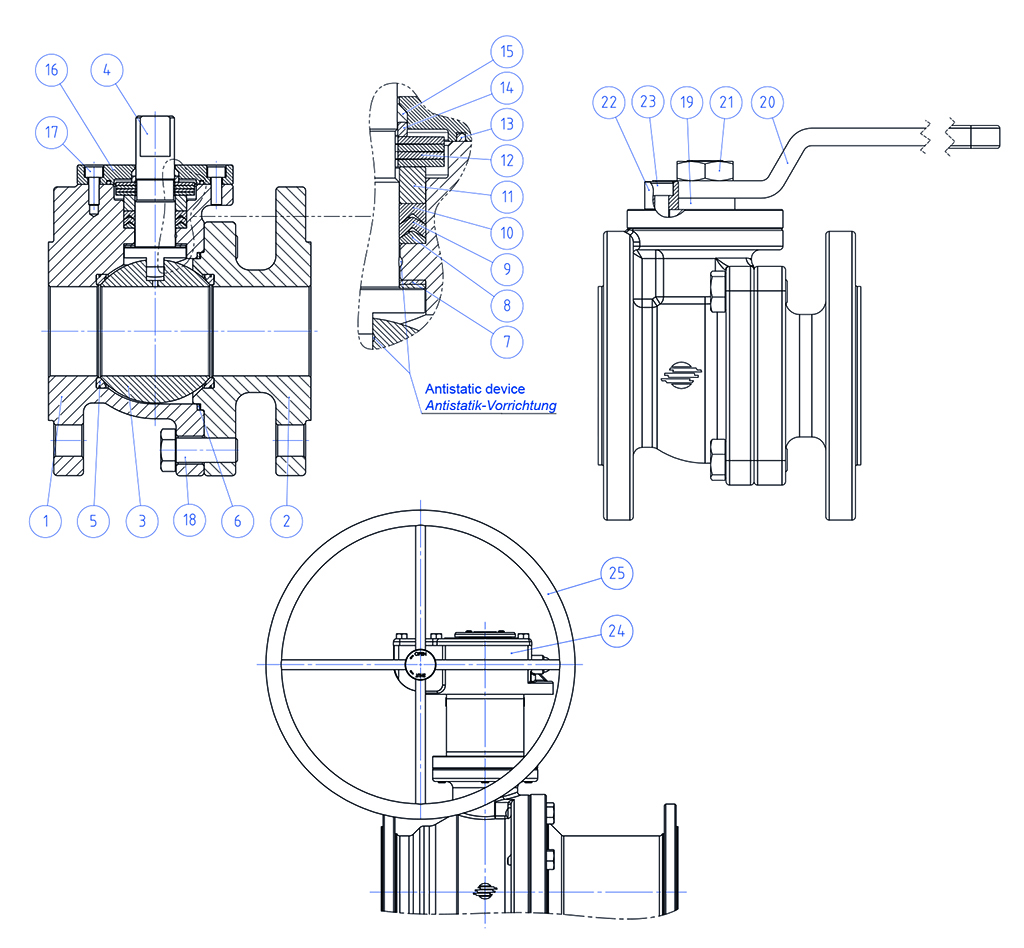 3 Dispositivo antiestático (continuidade elétrica entre esfera, haste e corpo) Evita-se a eletricidade estática que pode causar faíscas em um ambiente explosivo ou inflamável. Segurança garantida do contato durante toda a vida útil da válvula
